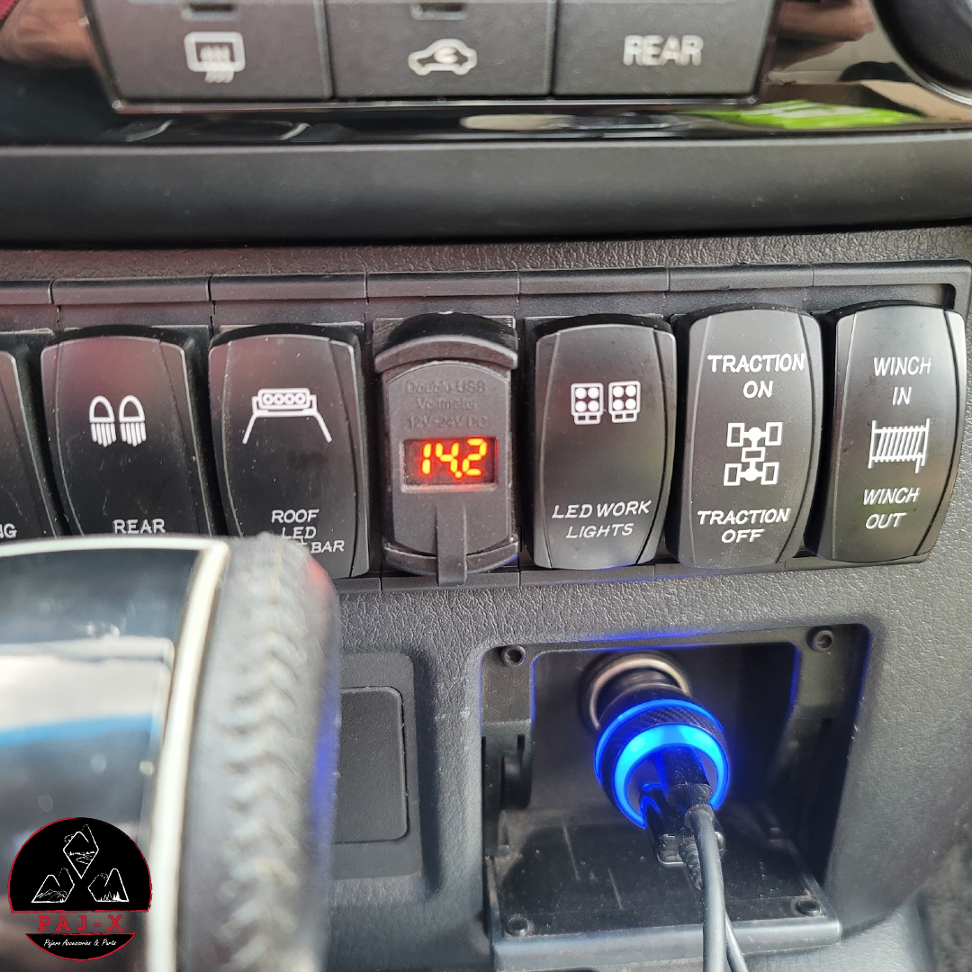 شاحن USB عدد 2 (مدخل واحد بخاصية الشحن السريع) + فولتميتر على شكل مفاتيح الروكر سويتش